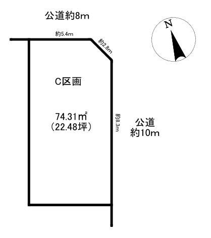 | 土地面積 | 実74.31㎡(22.47坪) | 接道 | 北側(公道)幅 約8.0m 間口 約5.40m 東側(公道)幅 約10.0m 間口 約8.30m |